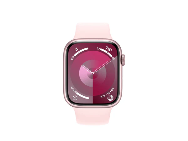 أبل ساعة سيريز9 جي بي اس - 45 ملم - هيكل من الألومنيوم باللون الوردي مع حزام رياضي باللون الوردي الفاتح - مقاس ميديم/لارج